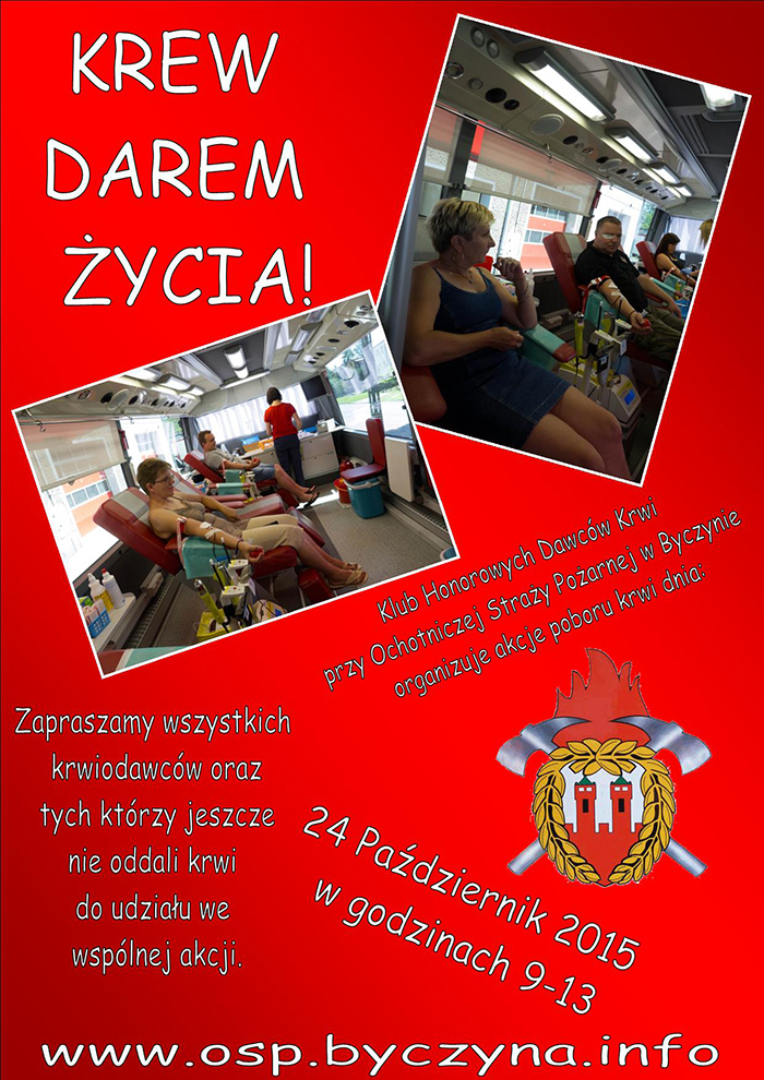 Klub Honorowych Dawców Krwi przy Ochotniczej Straży Pożarnej w Bycznie organizuje akcję poboru krwi dnia: 24 października 2015 w godzinach 9 – 13. Zapraszamy wszystkich krwiodawców oraz tych, którzy jeszcze nie oddali krwi do udziału we wspólnej akcji.