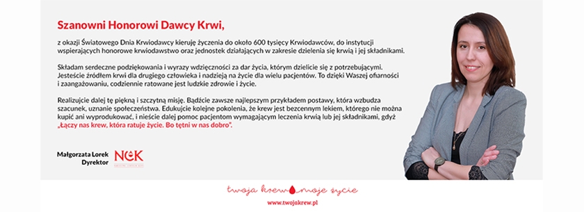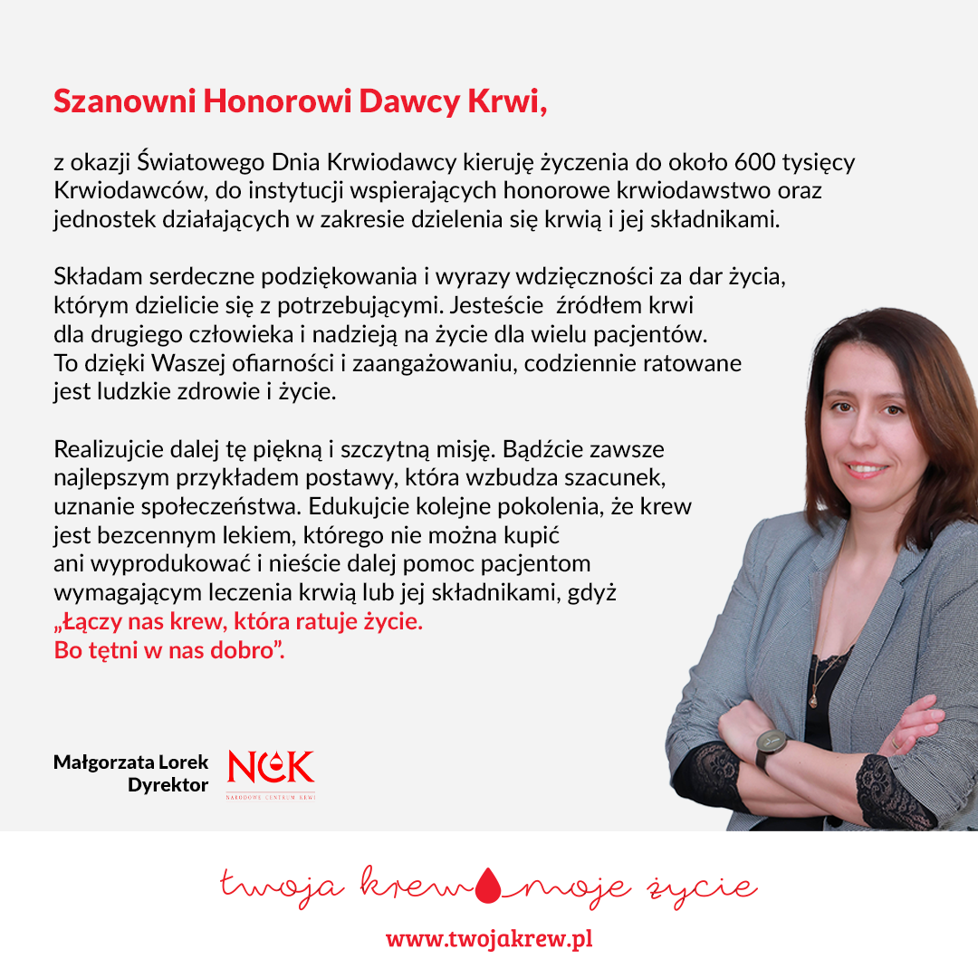 Dyrektor Narodowego Centrum Krwi Małgorzata Lorek przesyła życzenia