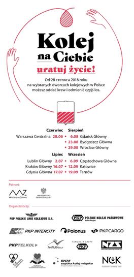 Taka osoba powinna mieścić się wiekowo między 18 a 65 rokiem życia. Na oddanie krwi należy przyjść wypoczętym i zdrowym, czyli nie mieć objawów przeziębienia i nie brać aktualnie żadnych leków (zasada ta nie dotyczy środków na nadciśnienie i antykoncepcyjnych). Najlepiej zjeść lekki posiłek, wypić około 2 litrów płynów (ważne, żeby zrobić to w ciągu 24 godzin przed pobraniem). Wskazane jest także ograniczenie palenia papierosów i nie picie alkoholu, dotyczy to również dnia poprzedzającego oddanie krwi. Tegoroczne przedsięwzięcie promujące honorowe krwiodawstwo wspierają spółki Grupy PKP, Fundacja Grupy PKP, a także Narodowe Centrum Krwi, Niezależne Zrzeszenie Studentów, PKS Polonus i Krajowa Rada Honorowego Krwiodawstwa Polskiego Czerwonego Krzyża. Akcja objęta jest patronatem Ministerstwa Infrastruktury i Ministerstwa Zdrowia. Czekamy na Was!