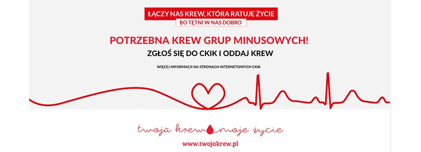 Kampania społeczna "Twoja krew, moje życie" realizowana w ramach programu polityki zdrowotnej pn "Zapewnienie samowystarczalności Rzeczypospolitej Polskiej w krew i jej składniki na lata 2021-2026" finansowana ze środków Ministra Zdrowia.