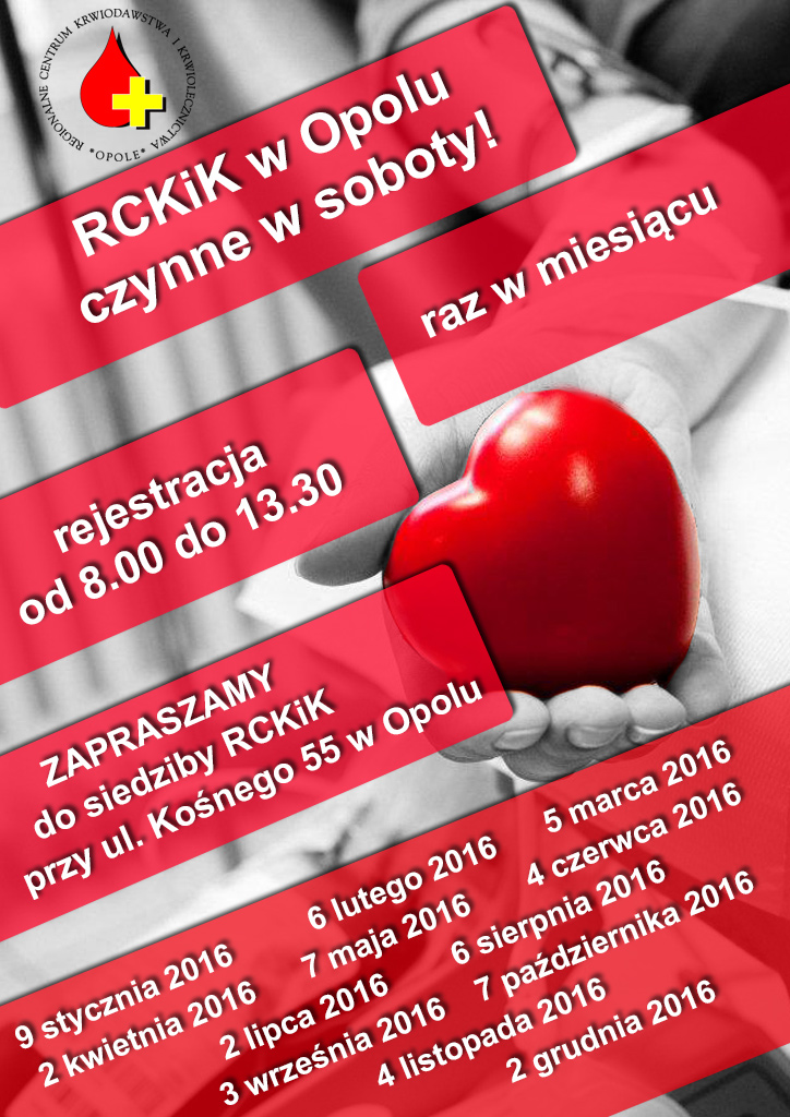 Wychodząc na przeciw oczekiwań Krwiodawców RCKiK w Opolu od maja 2015 roku umożliwia oddanie krwi w jedną sobotę w miesiącu w siedzibie RCKiK w Opolu na ul. Kośnego 55.