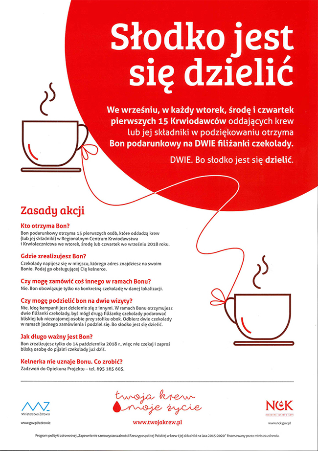 Kampania społeczna "Twoja krew, moje życie" realizowana w ramach programu polityki zdrowotnej pn "Zapewnienie samowystarczalności Rzeczypospolitej Polskiej w krew i jej składniki na lata 2021-2026" finansowana ze środków Ministra Zdrowia.