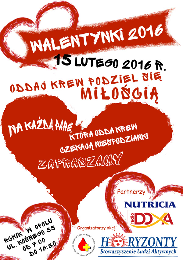 Jak co roku zapraszamy na walentynkową akcję krwiodawstwa. Oddaj krew - podziel się miłością już 15 lutego w RCKiK w Opolu. Dla wszystkich par specjalne nagrody. Zapraszamy!