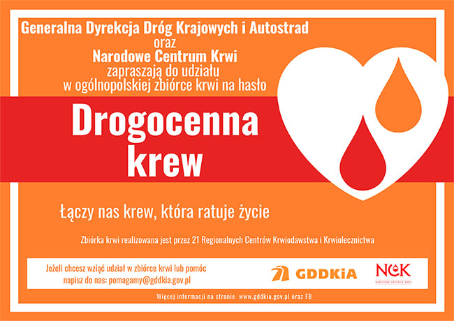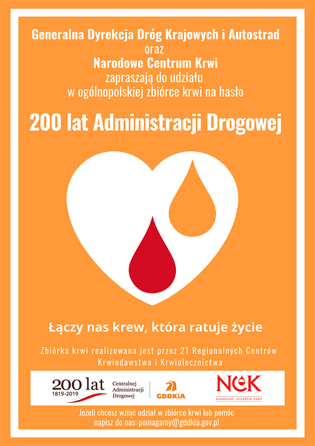 Ogólnopolska zbiórka krwi na hasło „200 lat Administracji Drogowej”, realizowana jest przez 21 Regionalnych Centrów Krwiodawstwa i Krwiolecznictwa do 31 grudnia 2019 r.
