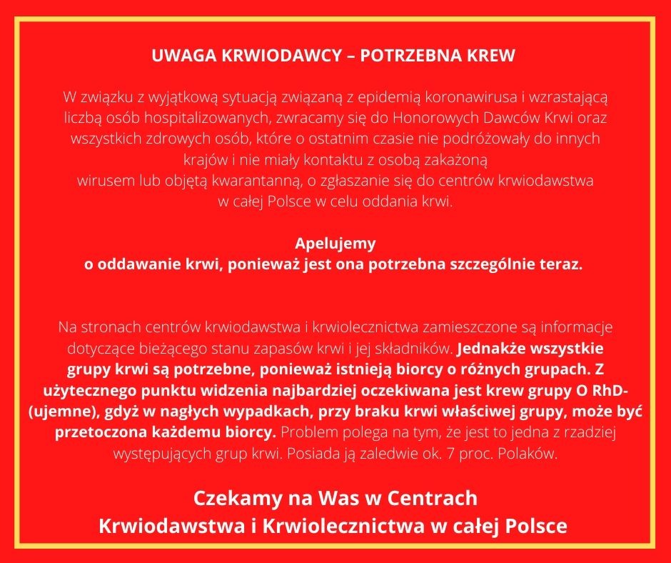 W związku z wyjątkową sytuacją związaną z epidemią koronawirusa i wzrastającą liczbą osób hospitalizowanych, zwracamy się do Honorowych Dawców Krwi oraz wszystkich zdrowych osób, które o ostatnim czasie nie podróżowały do innych krajów i nie miały kontaktu z osobą zakażoną wirusem lub objętą kwarantanną, o zgłaszanie się do centrów krwiodawstwa w całej Polsce w celu oddania krwi.