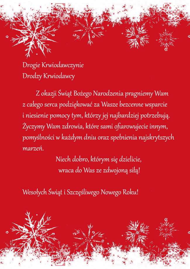 Z okazji Świąt Bożego Narodzenia pragniemy Wam z całego serca podziękować za Wasze bezcenne wsparcie i niesienie pomocy tym, którzy jej najbardziej potrzebują. Życzymy Wam zdrowia, które sami ofiarowujecie innym, pomyślności w każdym dniu oraz spełnienia najskrytszych marzeń. Niech dobro, którym się dzielicie, wraca do Was ze zdwojoną siłą!