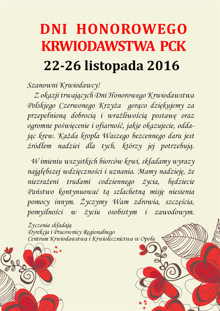 Życzenia składają Dyrekcja i Pracownicy Regionalnego Centrum Krwiodawstwa i Krwiolecznictwa w Opolu