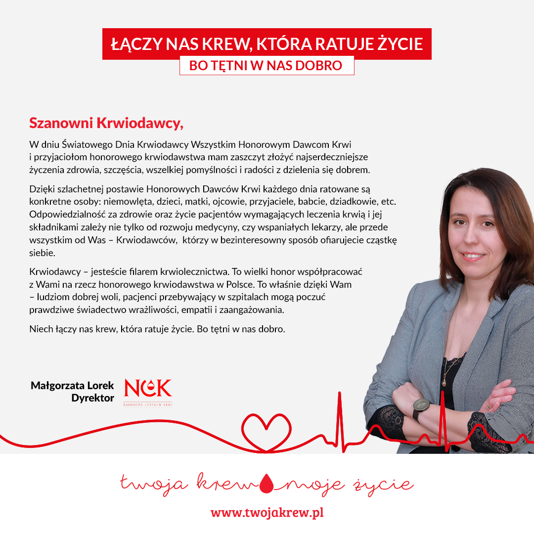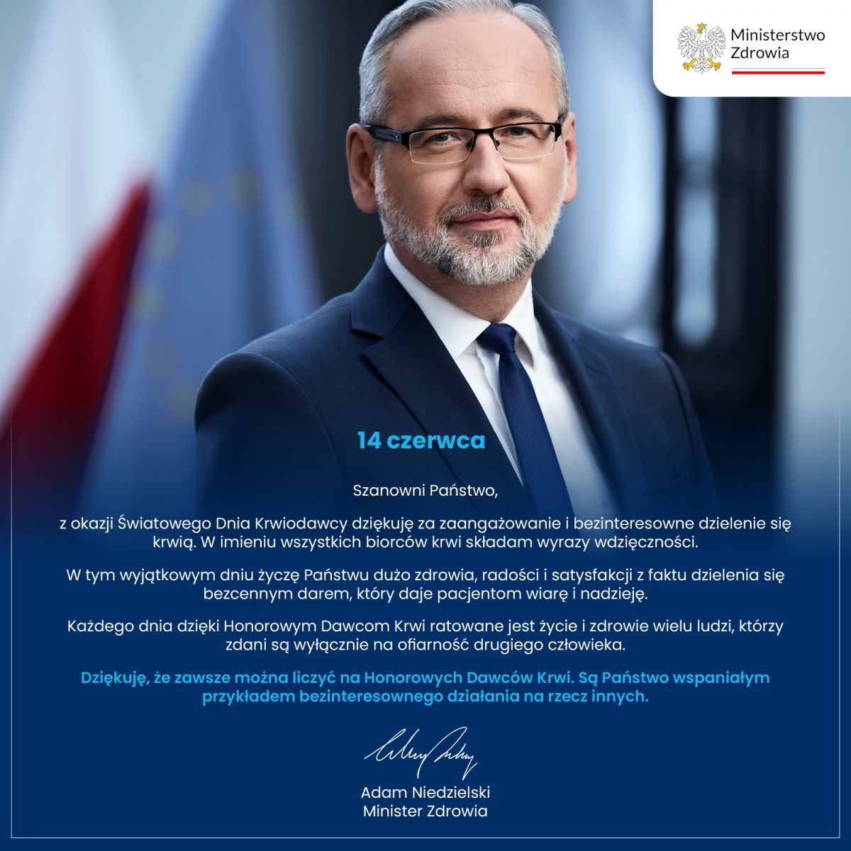 Przekazujemy życzenia nadesłane przez Ministra Zdrowia oraz Panią Dyrektor Narodowego Centrum Krwi, do których dołączają się Dyrekcja oraz Pracownicy Regionalnego Centrum Krwiodawstwa i Krwiolecznictwa w Opolu.
